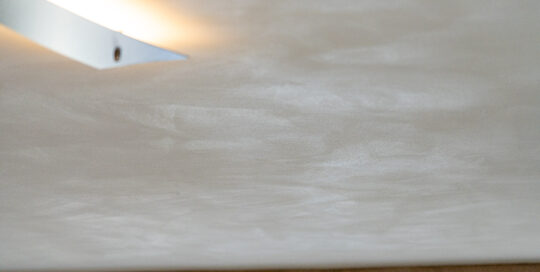 Auf Gewebespachtelung mit Kalk-Haftputz 2 Lagen Sumpfkalkputz von grob nach fein mit Schwamm gerieben leichte Wolkigkeit