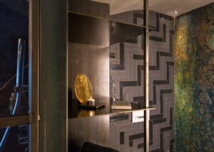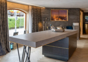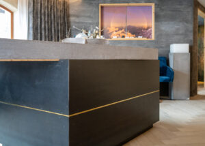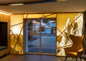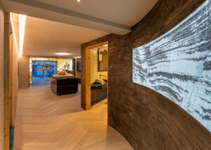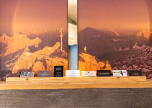 Sumpfkalkputz mit Struktur! Wandgestaltung mit 100% reinem Kalkputz in Bürstenstruktur. In der Wand ist ein Leuchtbildkasten verbaut mit dem Bildausschnitt eines heimischen Berges. Damit wollen die Betreiber sinnbildlich die Natur in die Räume holen. „Wir haben einen Kalkfelsen mit dem Kalkputz zusammengebracht. Wenn man das Leuchtbild dimmt, dann verschwindet das Motiv fast vollständig in der [...]