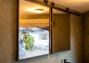Schiebetürenelement aus Schwarzstahl mit Spiegel und sichtbaren Laufrollen.