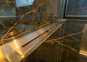Duschtrennwand aus Schwarzstahl mit getönten VSG-Glasschieben.