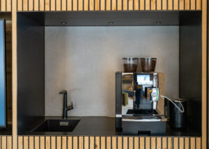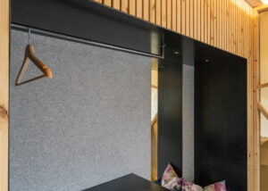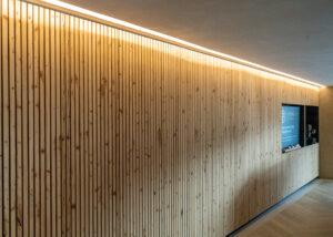 Die Schrankfront verleiht dem Raum ein stilvolles Aussehen und verbessert die Akustik erheblich, somit wird so eine Lattenwand auch sehr oft als Schallschutz in größeren Räumen verbaut.