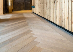 Fischgrätparkett, in diesem Raum in Eiche geräuchert, gebürstet und geölt, ist ein Stabparkett, bei dem die Stäbe im Winkel angeordnet sind. Ein Parkettboden in Fischgrät charakterisiert sich durch ein klassisches und lebhaftes Erscheinungsbild. Eingefasst ist der Fischgrät mit einem Randfries.